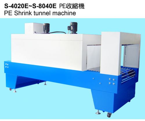 S-4020E~S-8040E hot air type shrink machines for PE films; they can also be used with PVC, PP, and POF films.