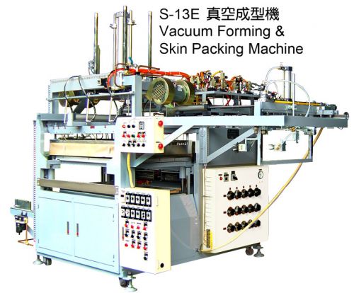 The S-13E have the extra function for skin packing. This machine is for the company who need to make packing blister in automatic, and also need to use skin packing machine. However, if the forming production is heavy or frail, operator should take out the products manually.